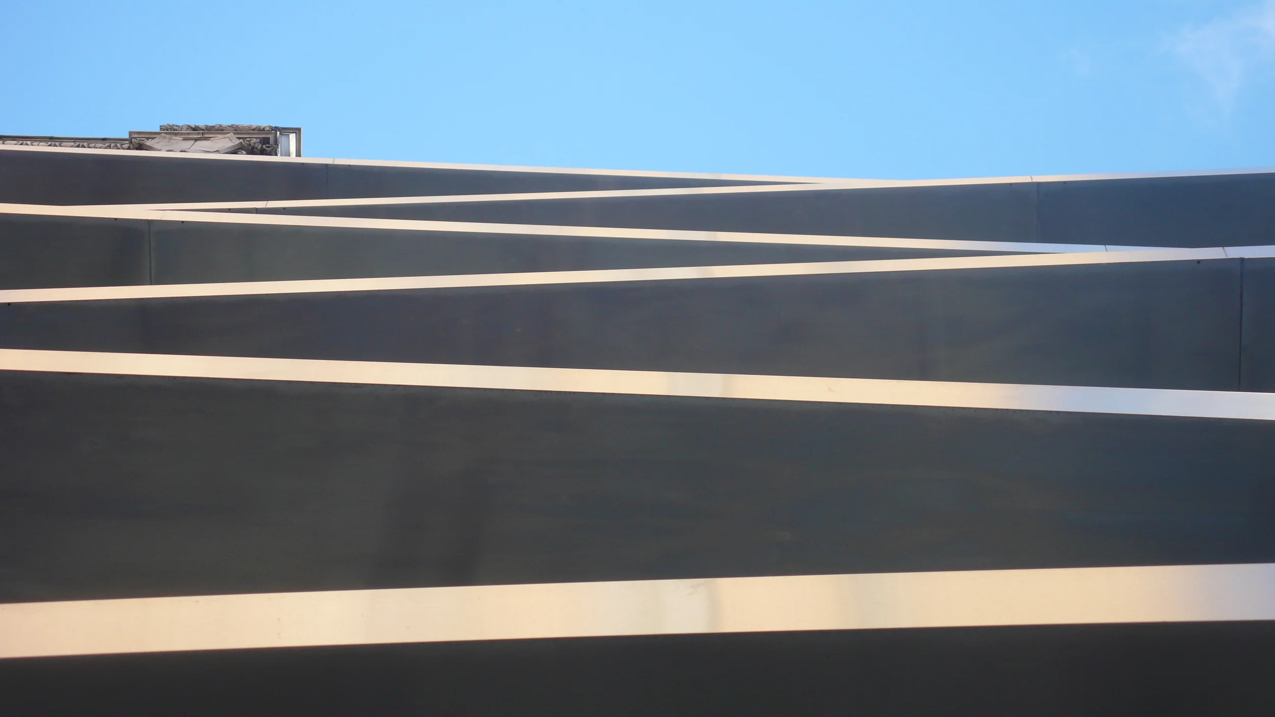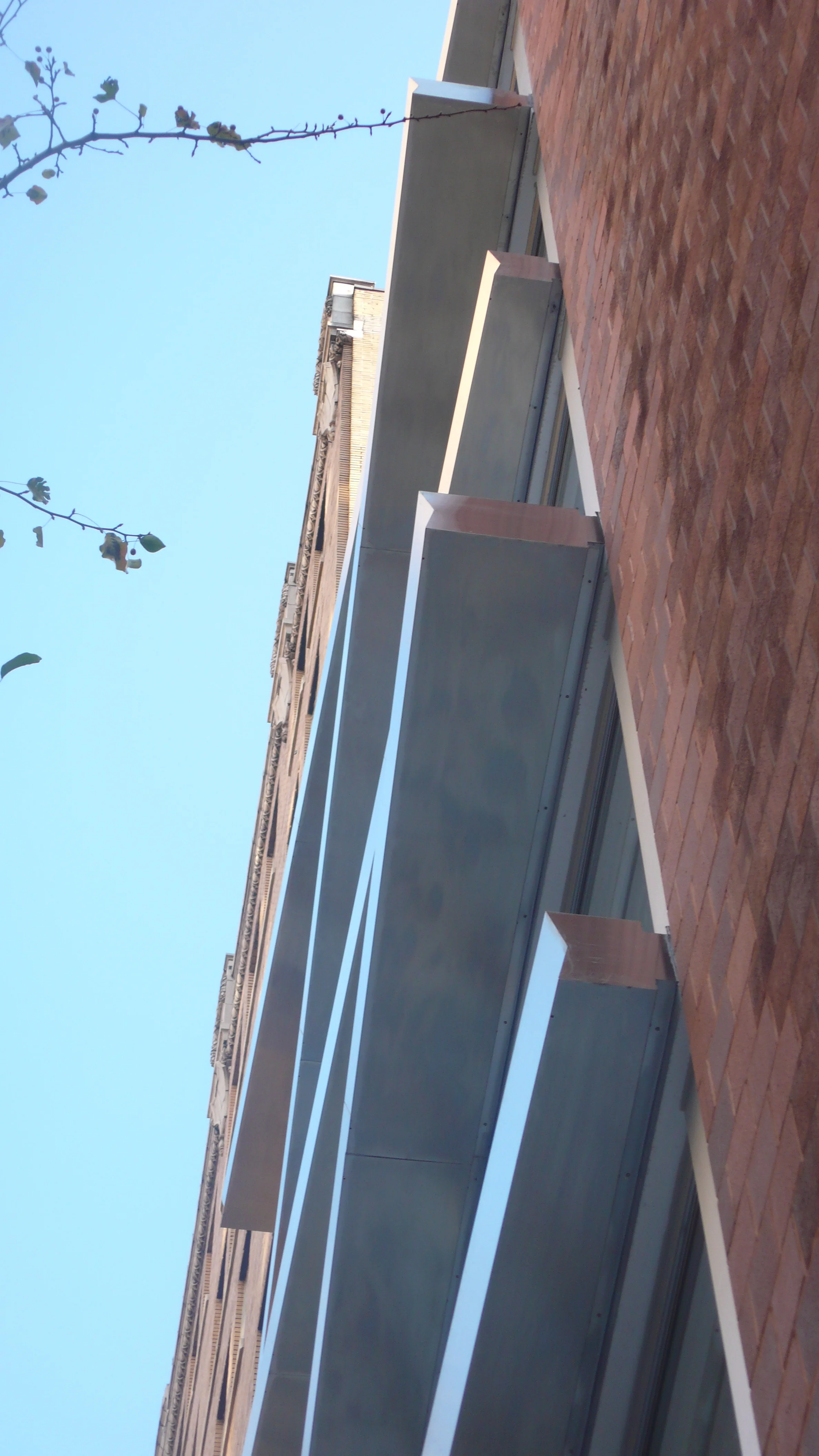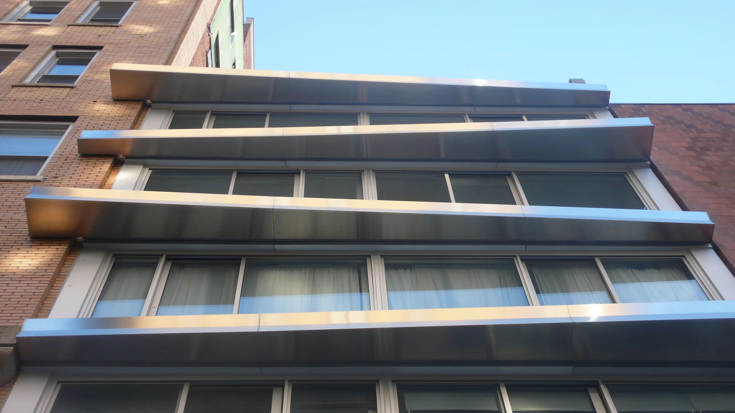 The restored factory building is being transformed by the overlapping extended stainless steel eyebrows stitching the older parent building and the angular addition. The shiny stringcourses project at slight angles, kind of like moving your eyes left to right to catch the views.