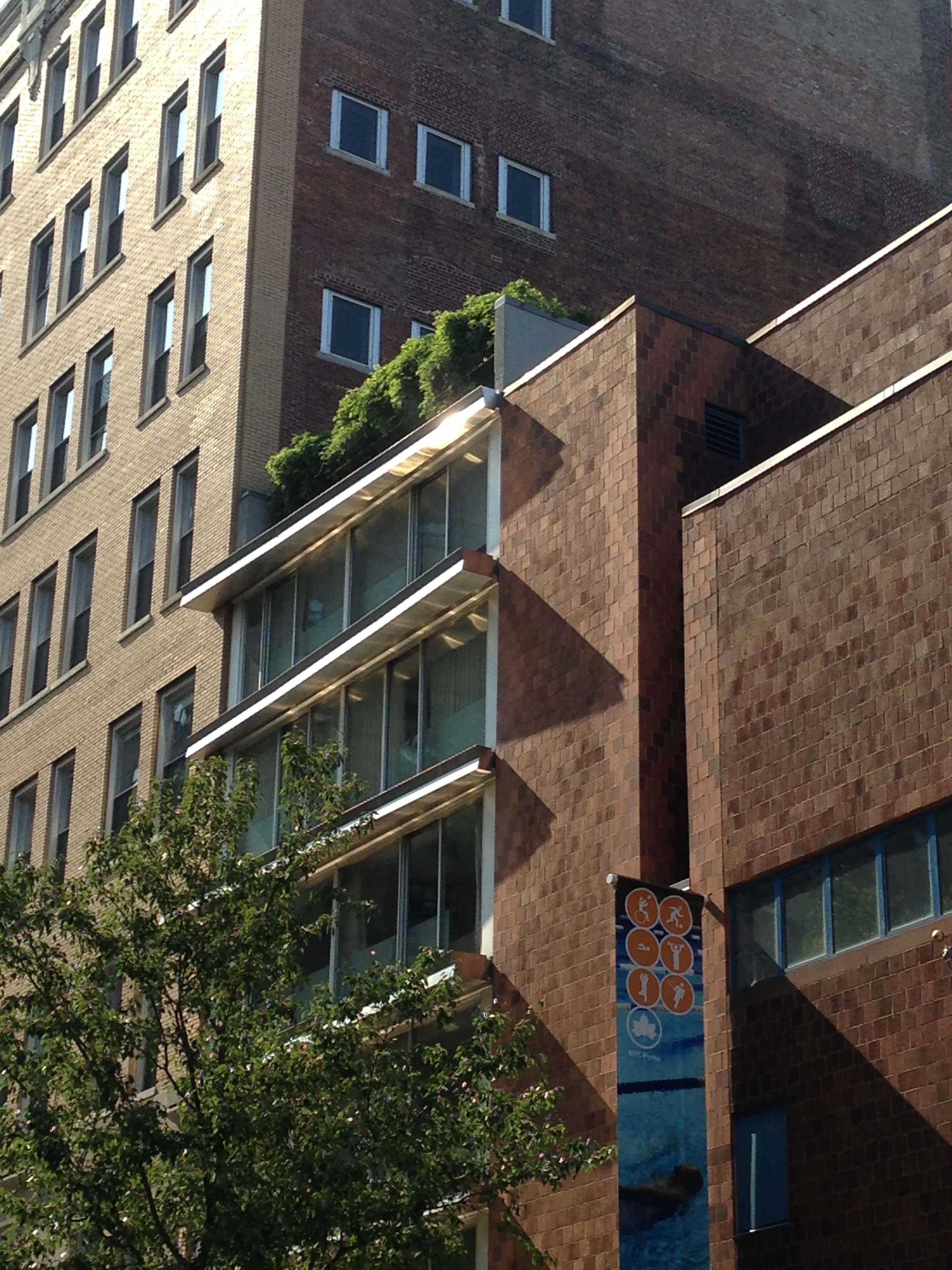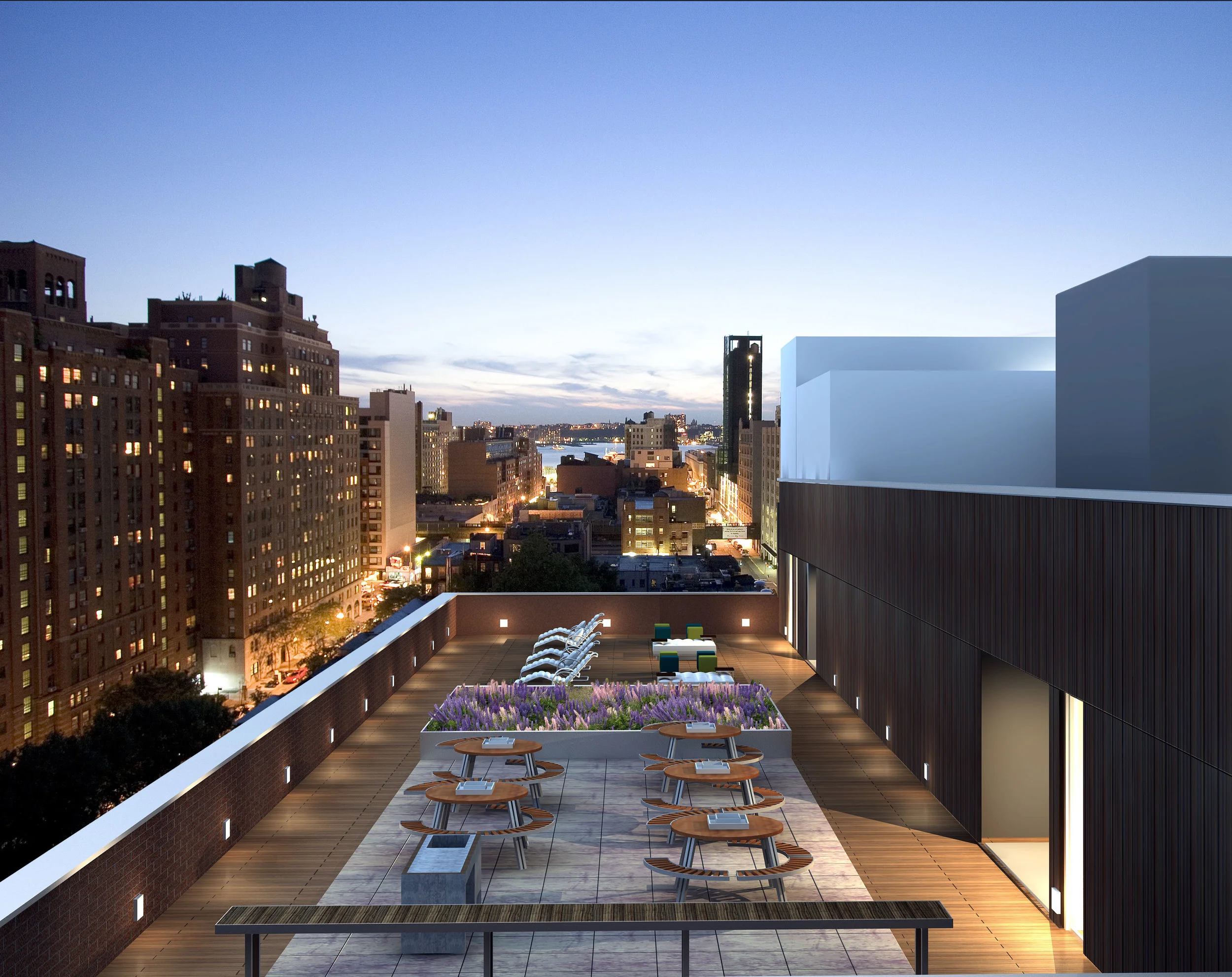 On the roof the wood deck is divided in two areas by a planted field of native grasses and wildflowers, species found on the Highline. The west “Day Deck” is animated by umbrellas, lounge chairs and cooled by outdoor showers. The east “Night Deck” is furnished with an outdoor bar, picnic tables, an outdoor grille and a fountain doubling as a beverage cooler. The deck area is surrounded by a running track, at once functional and voyeuristic.