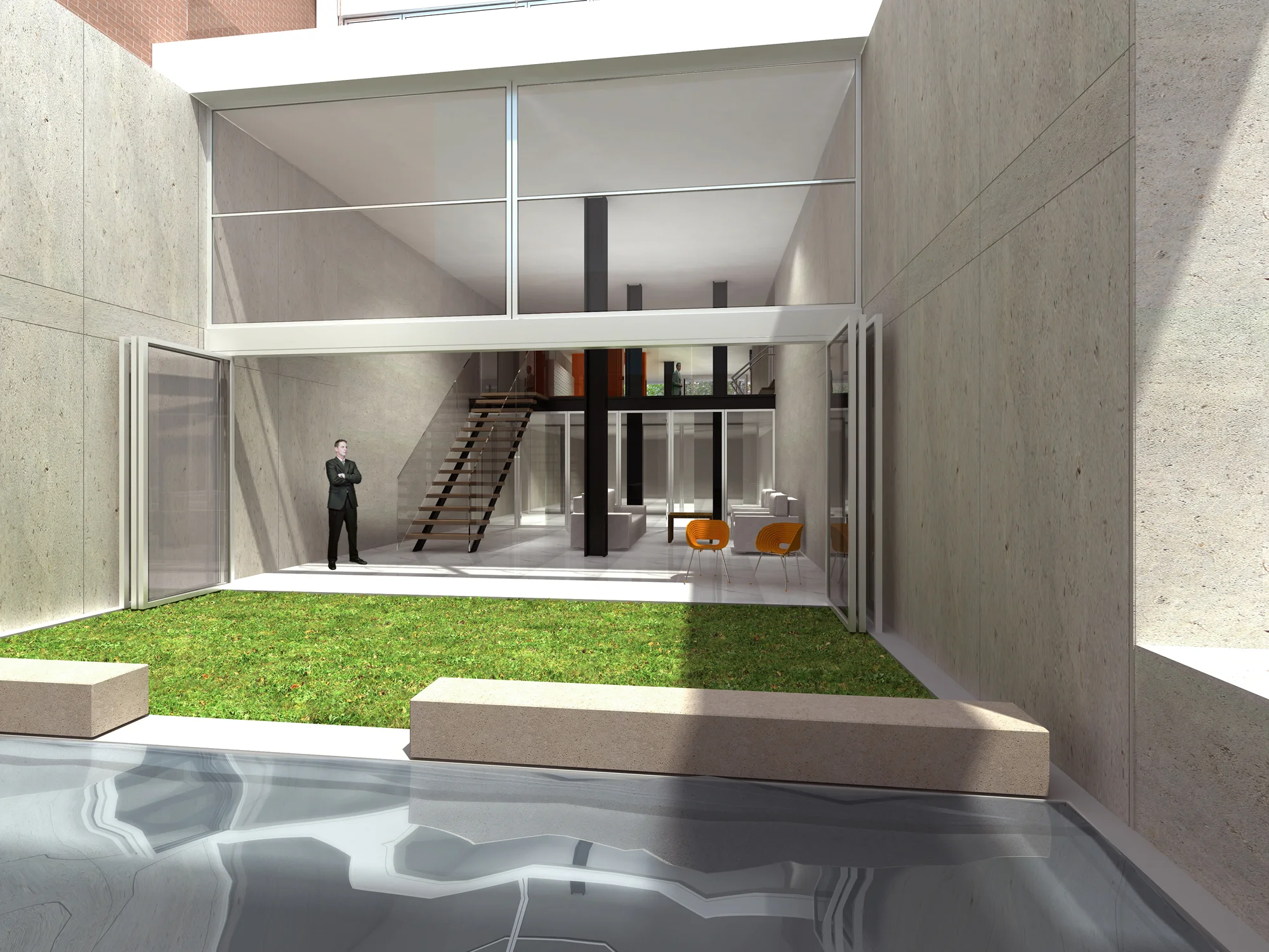 Melding artistic and architectural experimentation, the angled stringcourses are the replica of the aluminum backdrops of the “minimal pours” by one of the design partners who is also a gestural artist.