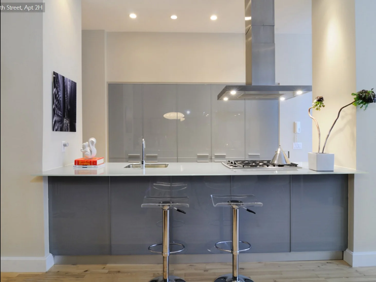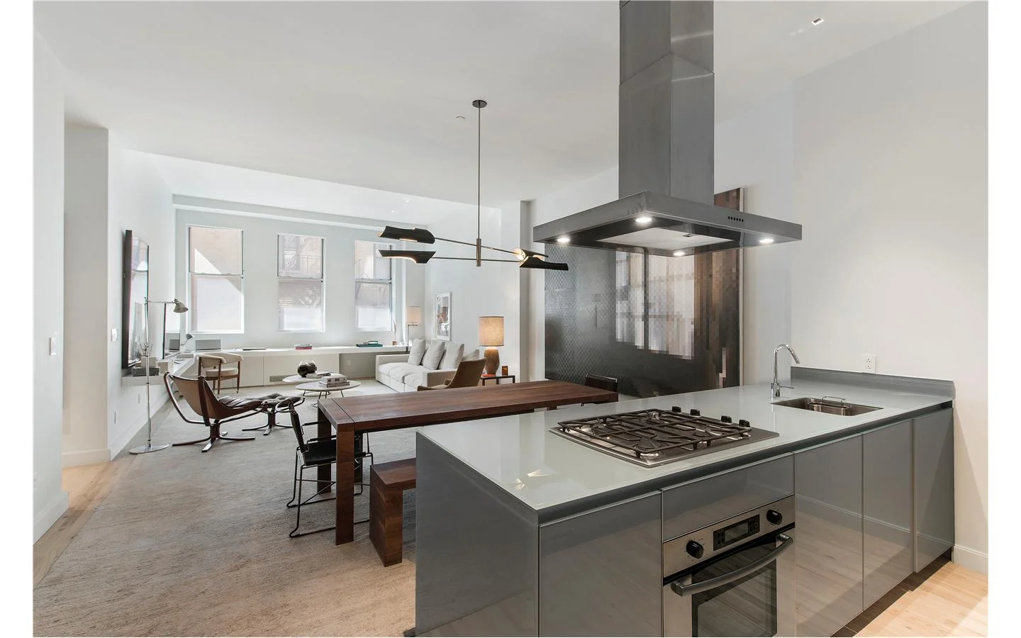 The design team’s solution for adjoining the seemingly very different facades was to stitch them together using stainless steel “eyebrows” that essentially staple the two buildings together while also creating visual movement and interest. Inside the loft apartments, 14-foot-high ceilings and large windows allow light to penetrate deep into the open floorplans. Designed with feng shui principles in mind, the elegant and minimalist interiors are characterized by light wood floors and a pale grey color palette that imbues residents with a feeling of Zen and serenity. Though simple in their lines, the kitchens and baths do impart a touch of luxury with their custom Italian cabinetry and fixtures by Schiffini and Nobili Spa.