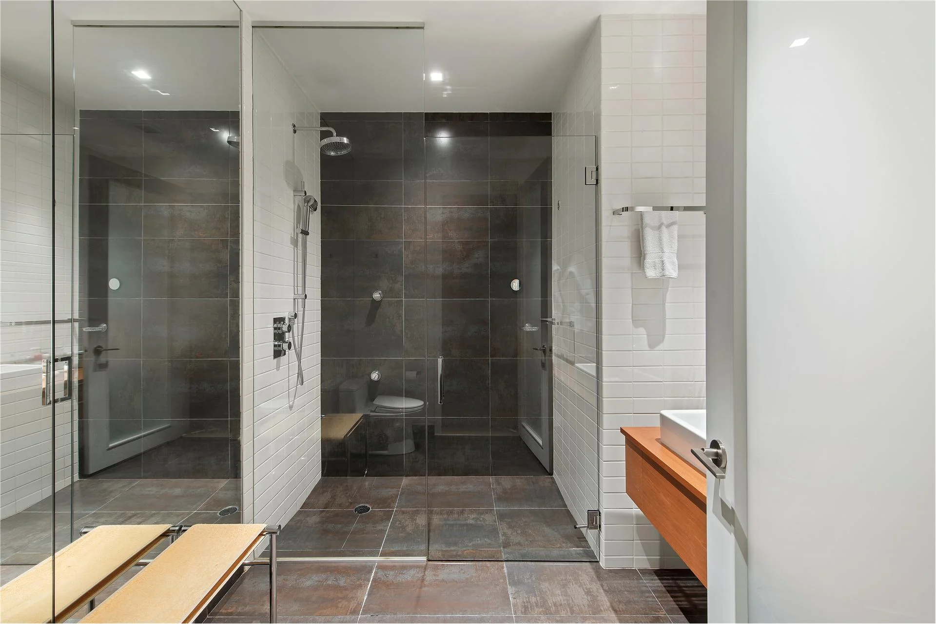 The Feng-Shui philosophy that guided the building architecture also informed theinterior design. The lofts benefits from the generous floor height which informed the development slogan: living tall and from the varied and well equipped common spaces. The light mat wood flooring, glass concealed kitchens, pale grey and metallic bathroom tiles, all contribute to the light and airy feeling of the interiors.